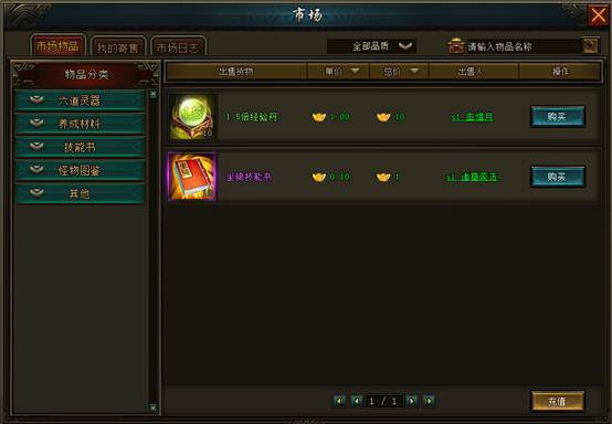 功能分类:市场物品、我的寄售、市场日志